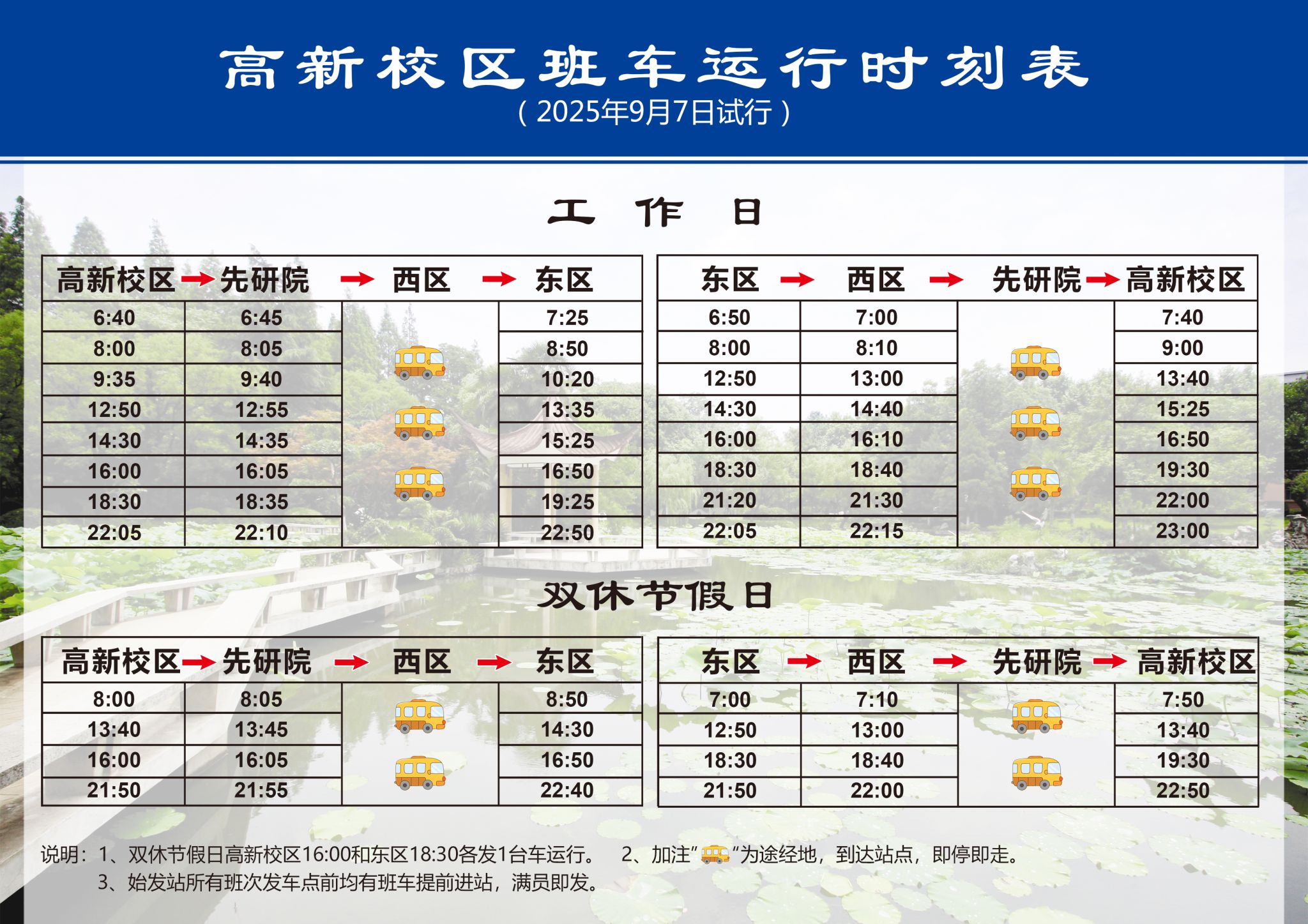 高新校区班车运行时刻表(2025年9月7日试运行)