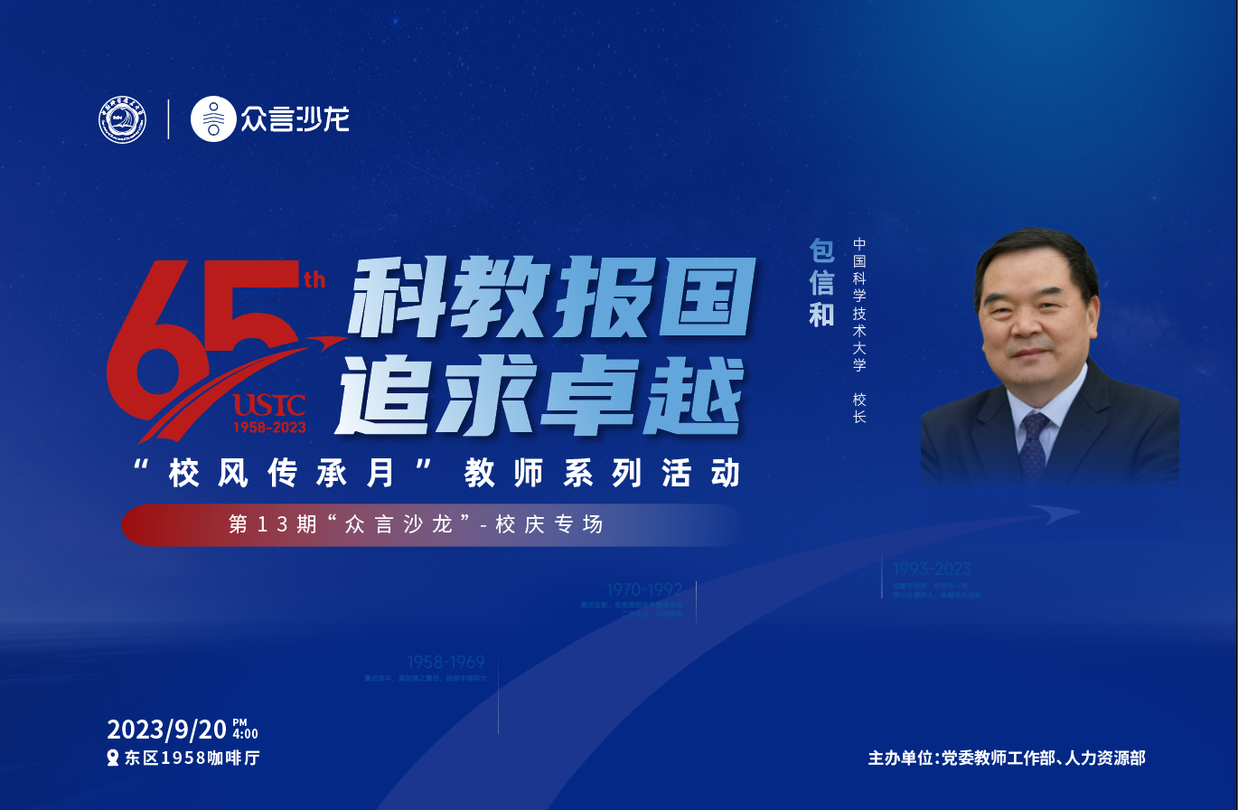 9月20日是中国科大建校65周年校庆日,作为问鼎官方app下载站校风传承月教师系列活动之一,第13期众言沙龙将以“科教报国,追求卓越”为主题举办校庆专场活动,邀请校长包信和作为嘉宾,与教职工代表进行面对面交流。