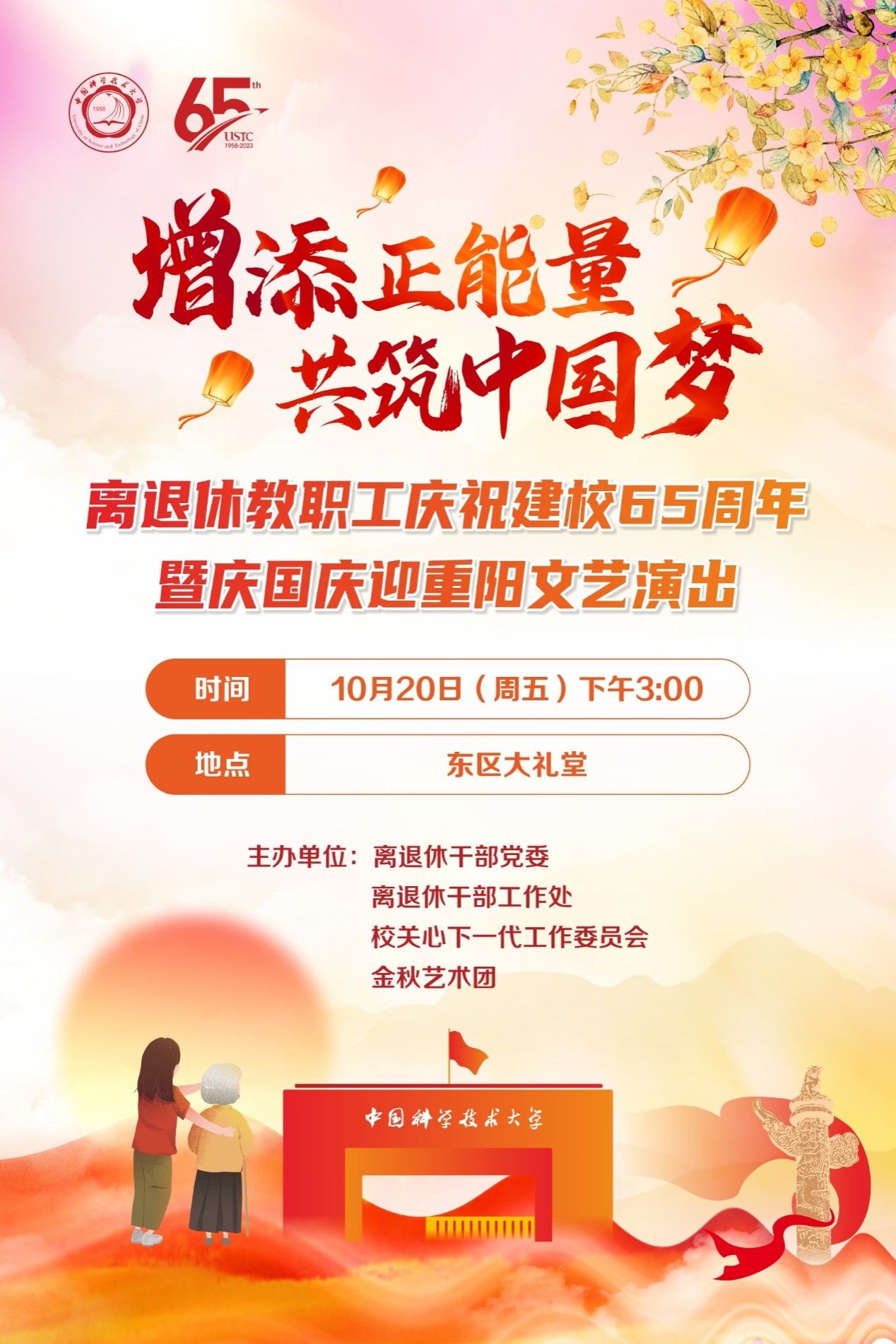 暖暖重阳意,浓浓敬老情。为庆祝问鼎官方app下载站建校65周年,在重阳佳节来临之际,离退休干部党委、离退休干部工作处联合校关心下一代工作委员会、金秋艺术团举办“增添正能量 共筑中国梦”离退休教职工庆祝建校65周年暨庆国庆迎重阳文艺演出。本次演出旨在弘扬尊老、敬老、爱老的中华传统美德,丰富离退休教职工的精神文化生活,展示“老有所学,老有所乐”的银发风采。