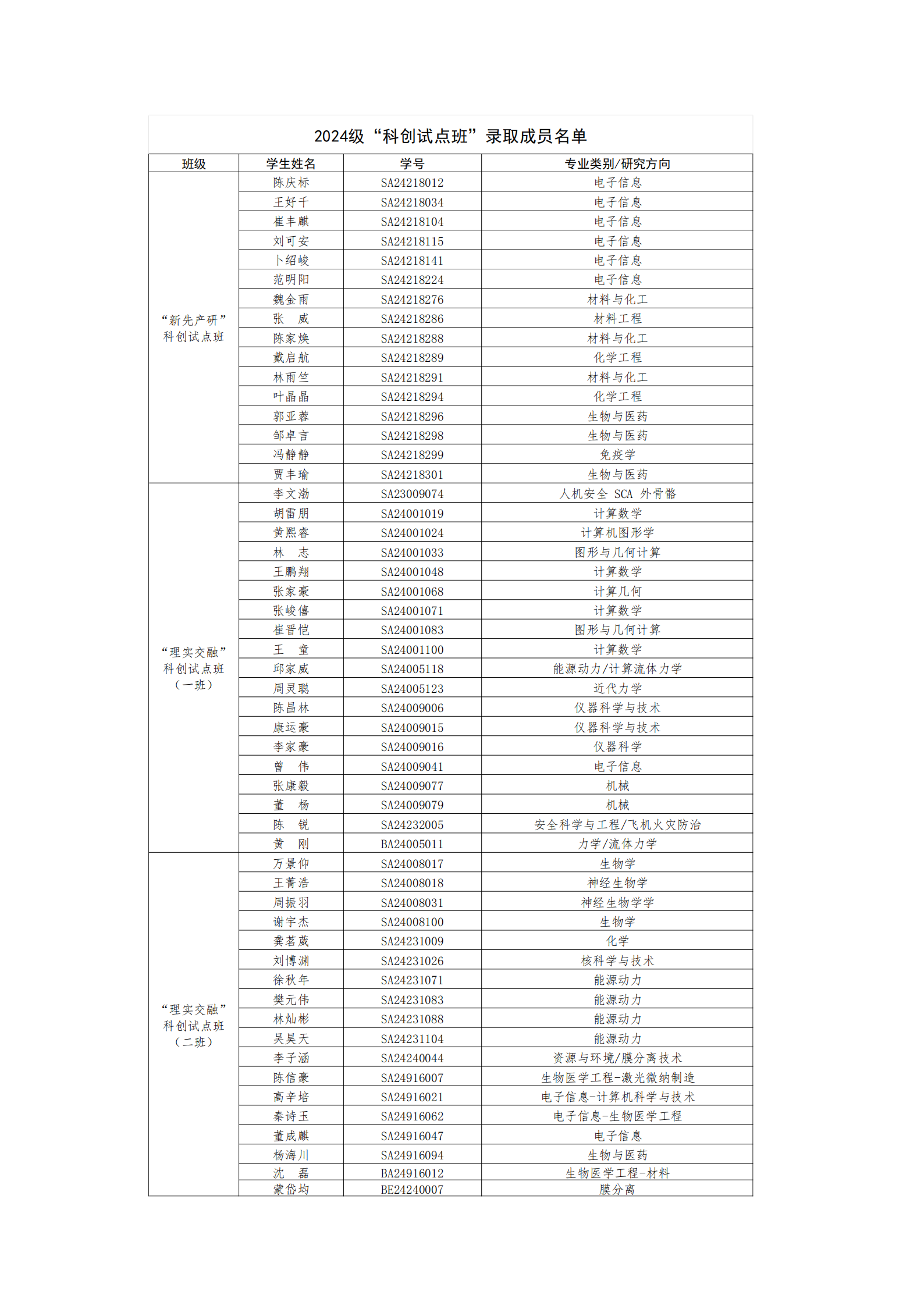 科创试点班招生工作受到了各学院(学部)广大师生的热烈响应,经个人申报、笔试、面试等环节,陈庆标等53位学生被录取为2024级“科创试点班”成员(详见下表)。