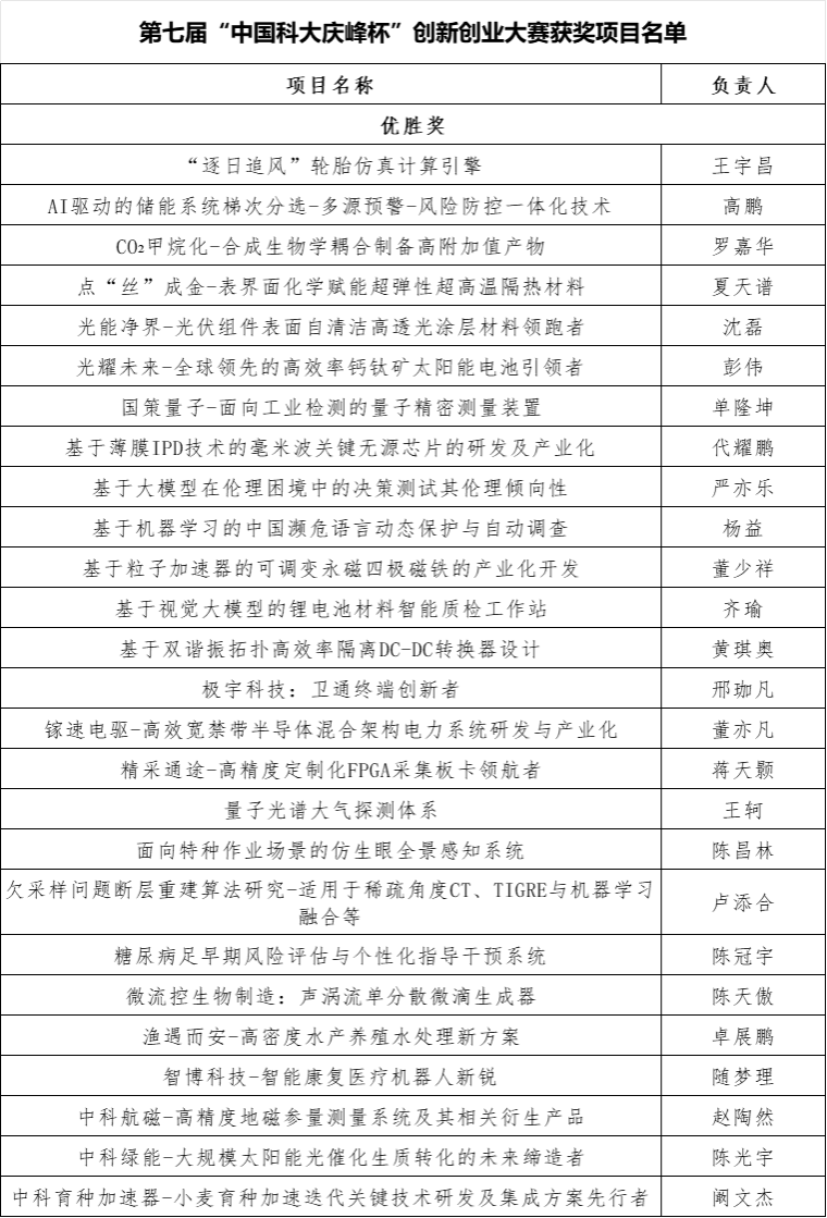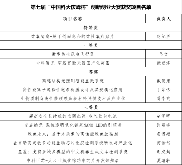 6月7日,第七届“中国科大庆峰杯”创新创业大赛决赛成功举行。经资格审查、初赛复赛、决赛路演答辩及专家评审合议等环节,现将本届大赛获奖项目公示如下(同等奖项排名不分先后,按项目名称首字母排序):